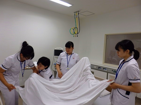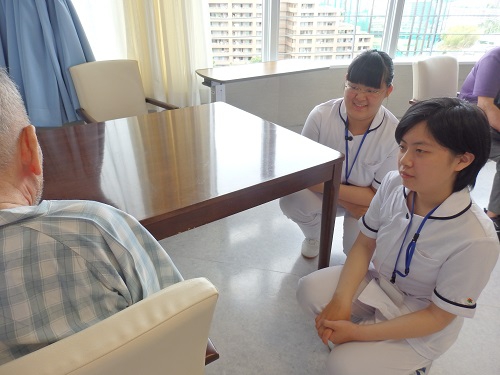 ・脈を測定や心音を聴取、入院ベッドのシーツを交換、そして目線を合わせて患者さんの