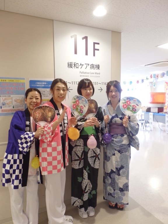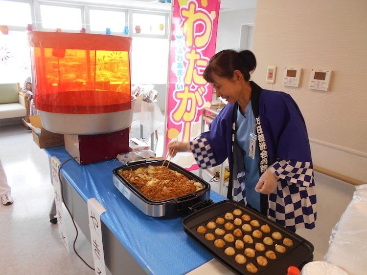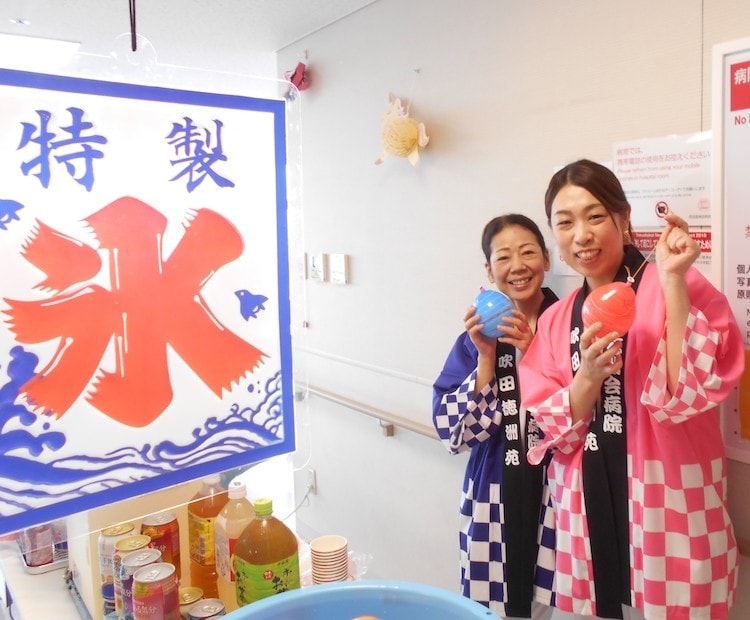 お祭りと言えば、縁日も楽しみのひとつです。かき氷やたこ焼きなど食べ、私たちスタッフも浴衣姿で参加し、夏祭りの雰囲気を盛り上げました。患者さん、御家族のたくさんの笑顔をいただき夏祭りのすてきな思い出ができました。